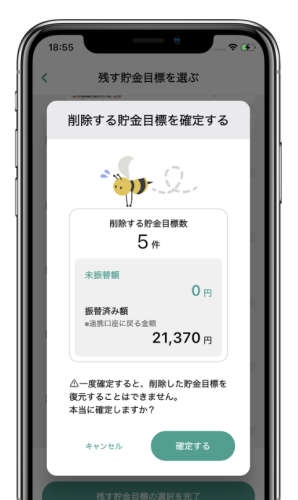※ゆうちょ銀行と連携いただいているお客様、つもり貯金の設定をいただいているお客様は、finbeeで行った貯金は架空の貯金となっておりますので、貯金目標を削除しても口座にお金は振替されません。